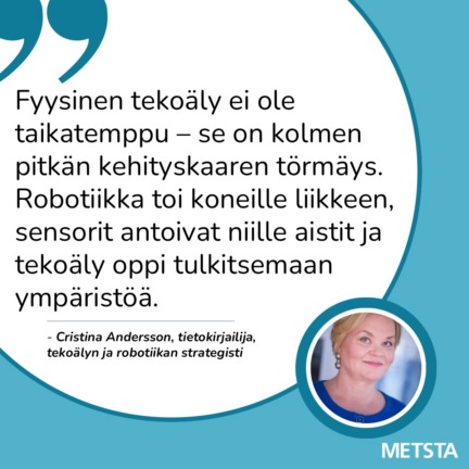 Fyysinen tekoäly tarkoittaa järjestelmiä, jotka havaitsevat, oppivat ja toimivat fyysisessä maailmassa: robotteja, koneita ja autonomisia järjestelmiä, jotka kykenevät tekemään päätöksiä reaaliajassa ja mukautumaan ympäristöönsä. Tänä päivänä fyysinen tekoäly on siirtynyt laboratorioista teollisuuden strategisiin keskusteluihin. Aikoinaan sähköistys, automaatio ja digitalisaatio muuttivat tuotantoa perustavalla tavalla. Samalla lailla fyysinen tekoäly disruptoi ajassamme tuotantoa, prosesseja ja logistiikkaa.